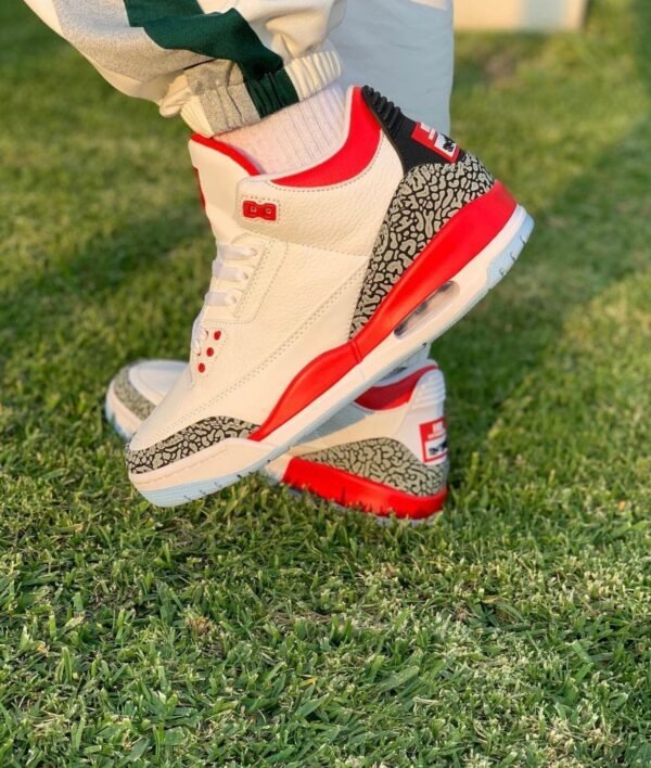 The Air Branded 3 Retro for grade-schoolers, nicknamed. The shoe has a white leather upper with the heel and forefoot overlays. The perforated leather collar, the polyurethane midsole, molded eyelets, the tongue embroidered with the Jumpman logo, and the heel tab embossed with the Branded Air logo all sum up the iconic features.